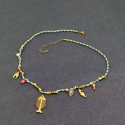 18K Golden SS Fishbone Charm Colored Rope Necklace - FGS