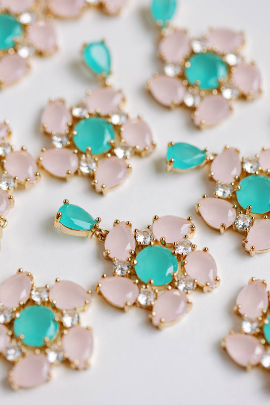 Pink and Turquoise Diamond Pinwheel Statement Earrings