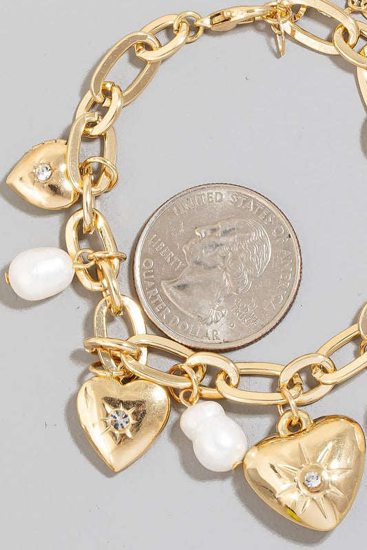 Studded Heart And Pearl Charms Chain Bracelet: GDCRM