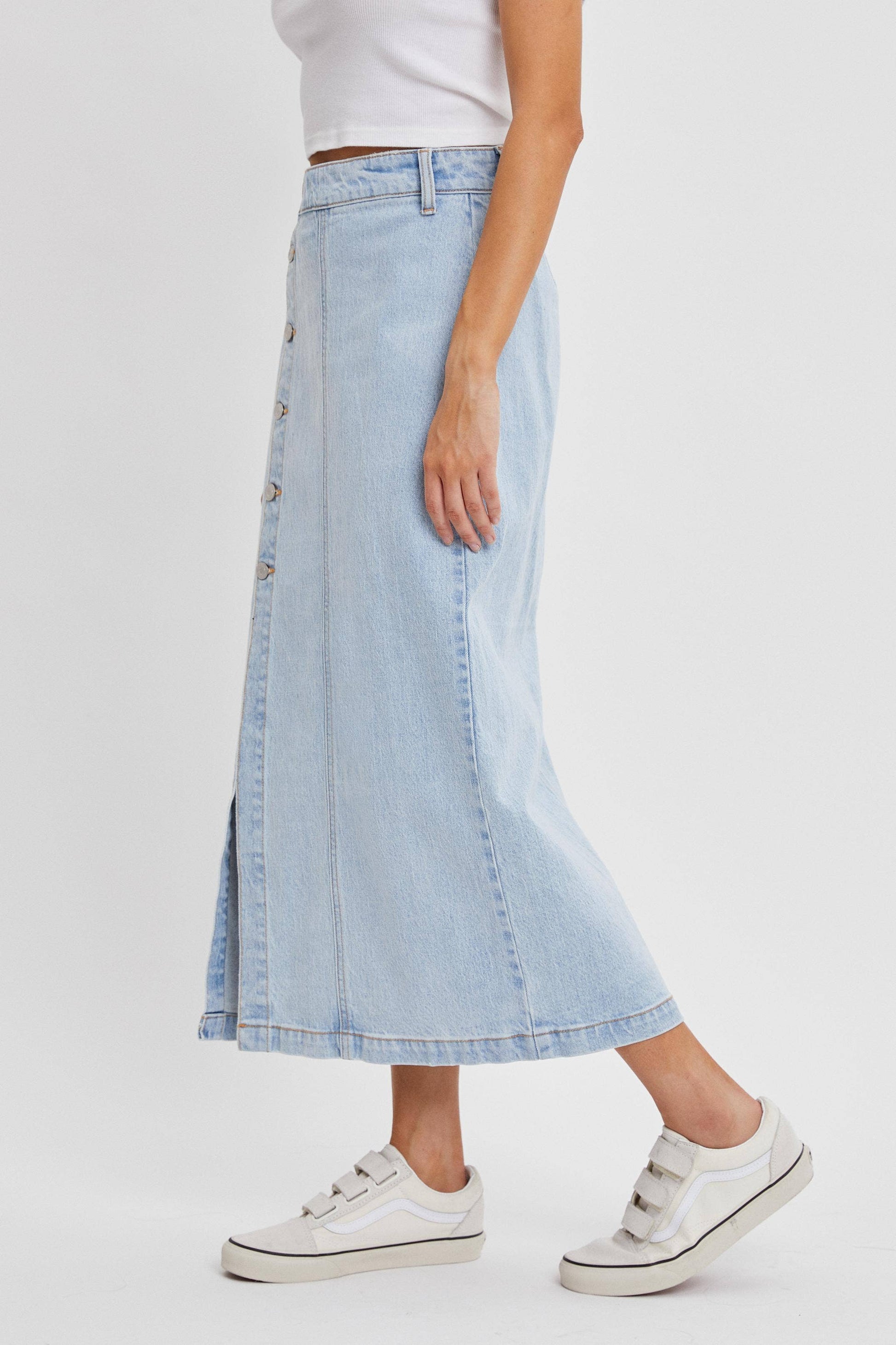 High Rise Denim Midi Skirt with Button Up Slit [WV59181SLT]: M